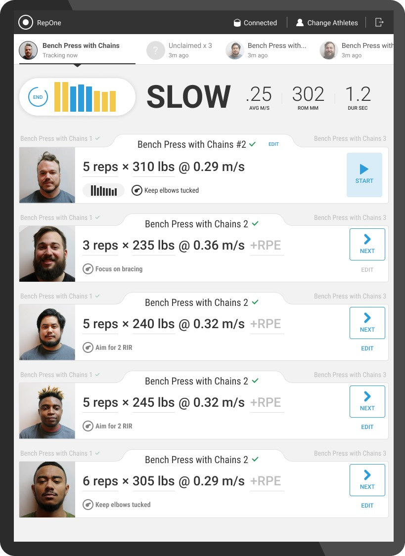 Live Metrics. As data comes in, information about how well you executed each rep is automatically logged, stored, and compared against previous sessions.